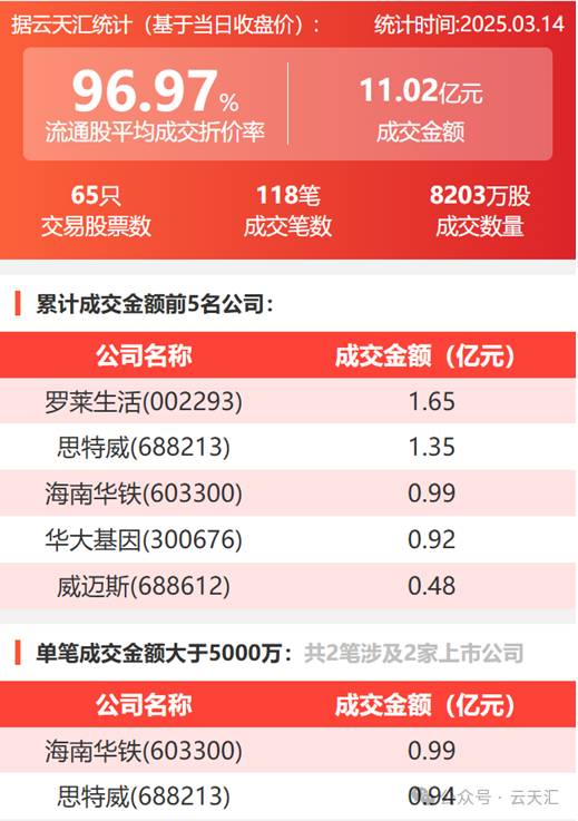 2025年3月14日,大宗交易成交金额11.02亿元,交易股票数65只,成交笔数118笔,流通股平均成交折价率96.97%,成交数量0.82亿股。