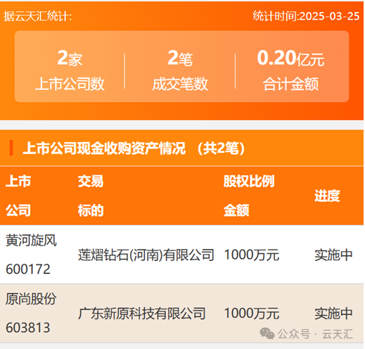 2025年3月25日,资产交易成交金额0.2亿元,上市公司2家,成交2笔,上市公司现金收购资产2笔。