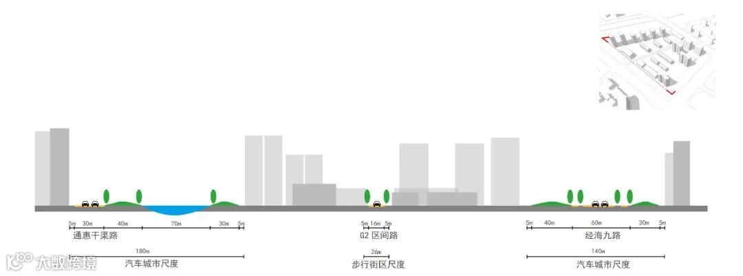 基于不同的街区尺度,设计适合的城市街景。G2区间路两侧以多层建筑为主,形成较开阔的城市空间,打造宜人的邻里街区感受。社区内部注重小区组团景观的打造,充分利用不同的建筑高度,形成丰富的内部社区关系。