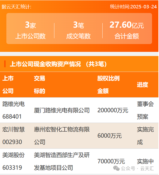 27.60亿元,上市公司3家,成交3笔,上市公司现金收购资产3笔。