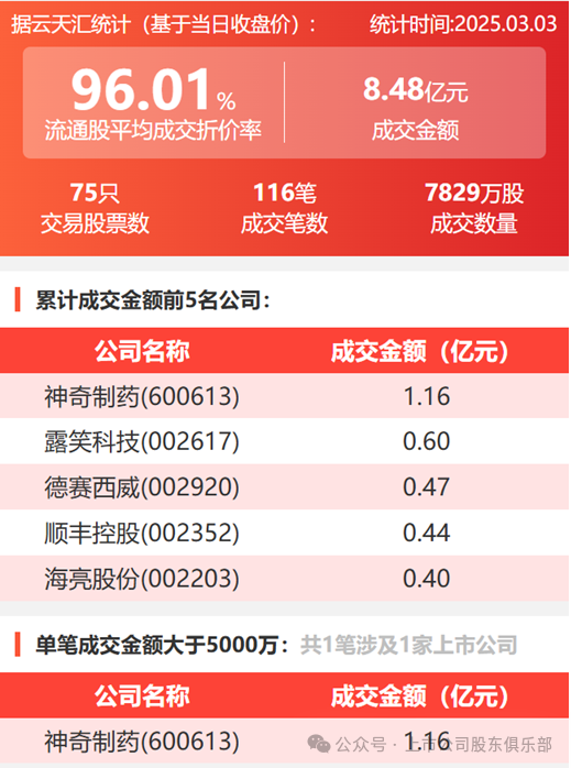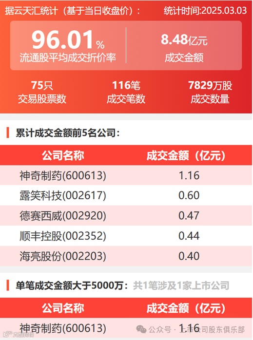2025年3月3日,大宗交易成交金额8.48亿元,交易股票数75只,成交笔数116笔,流通股平均成交折价率96.01%,成交数量0.78亿股。