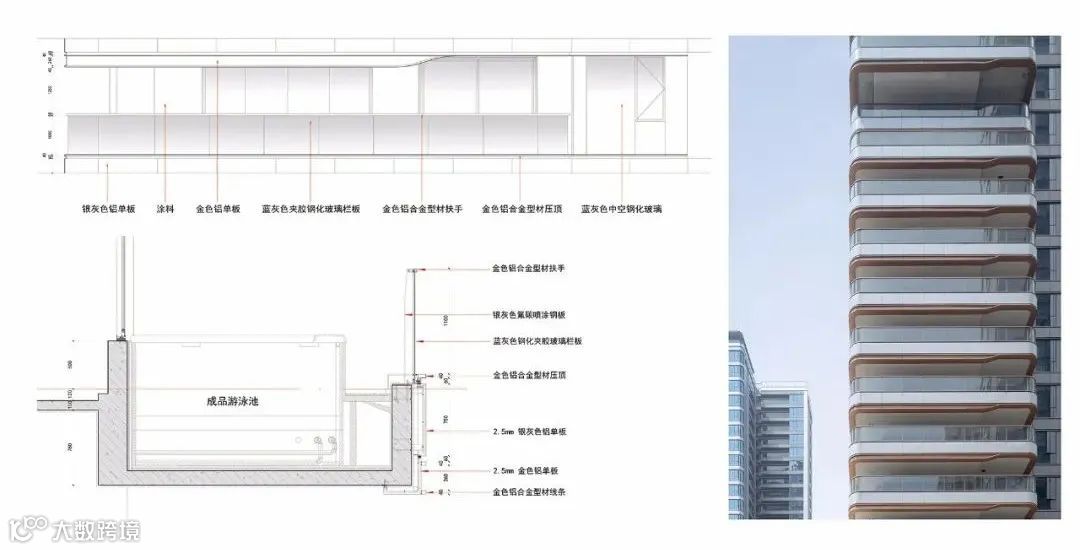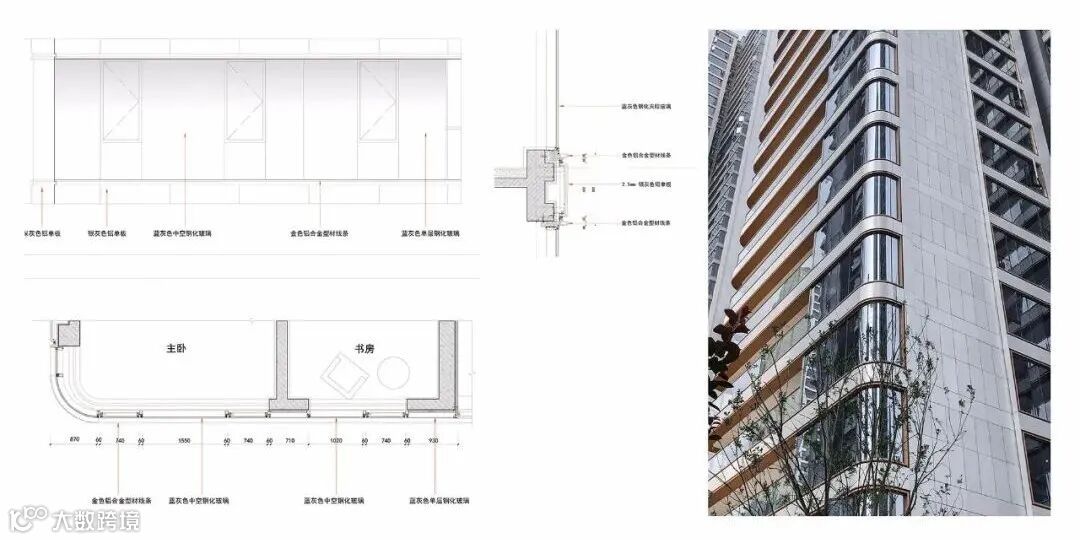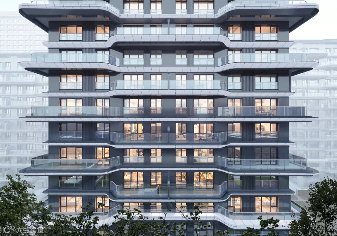 天阳·云栖奇岭立面为例,纯现代的极简造型,铝板搭配大面积灰蓝色LOW-E玻璃,满满金属“高级灰”。平均0.6的南向黄金窗墙比,云影流焕,山水入席。