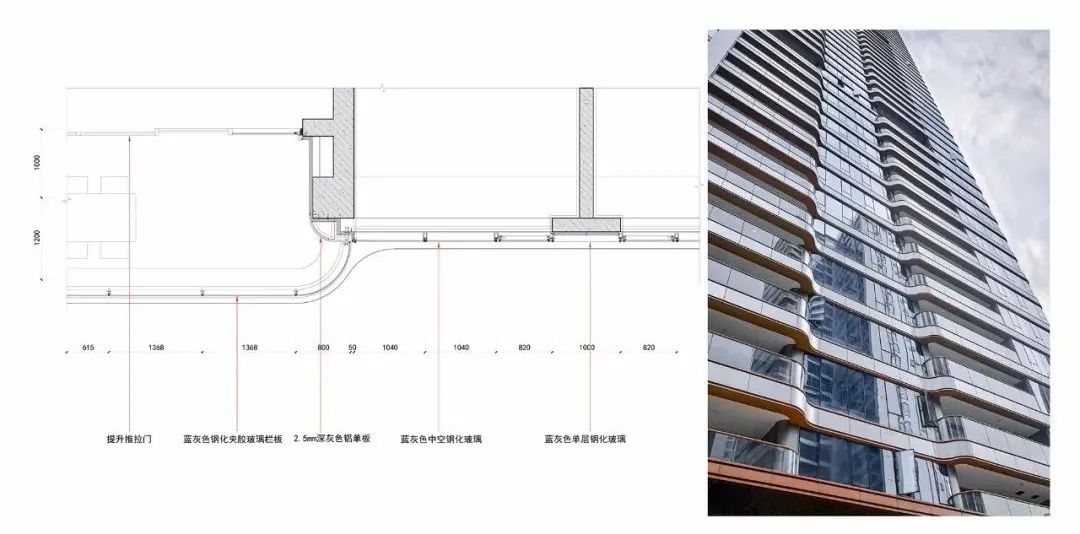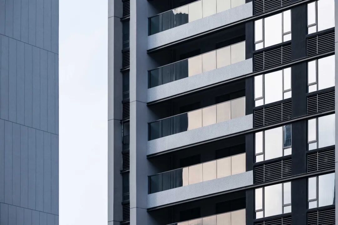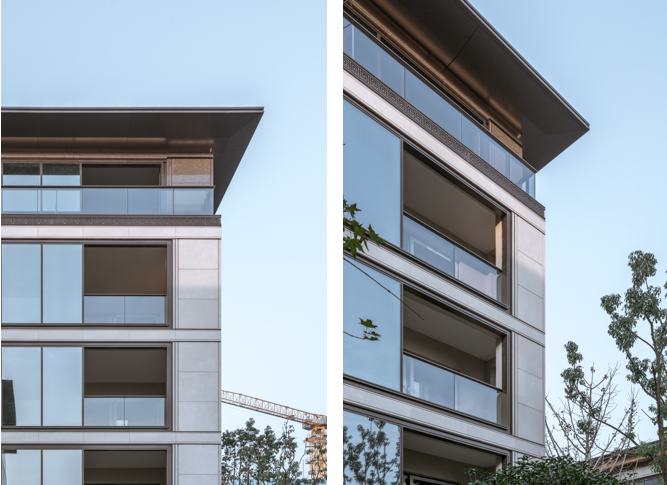 另外,玻璃栏板在普通住宅设计过程中会容易被忽略,但细究会发现,玻璃栏板在主立面的占比近1/3,它的精细度将对整个立面产生较大影响。所以在设计中,我们反复研究如何做到简洁存粹的栏板。栏板立柱内推,选择热反射镀膜夹胶玻璃,保证玻璃栏板整洁和具备一定遮蔽性,避免可见阳台内的杂物。