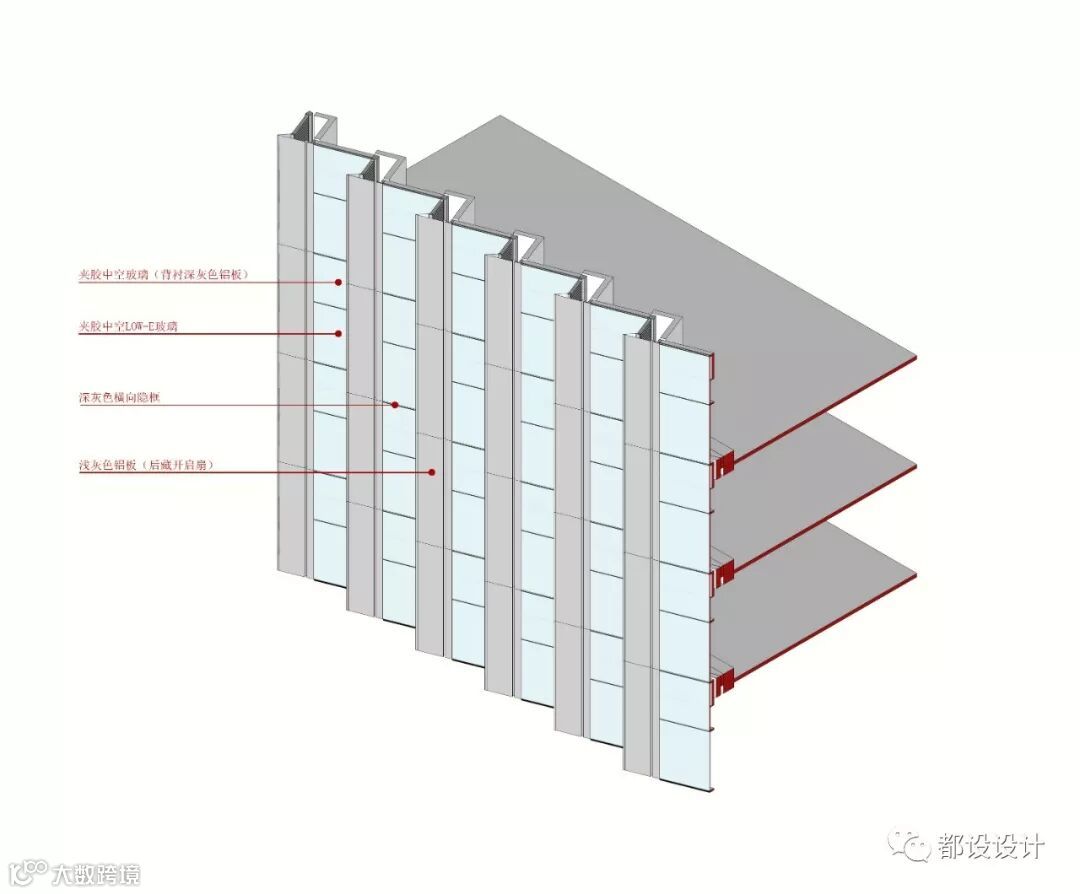 主体外罩超白钢化中空双银LOW-E玻璃幕墙,铝板采用铝单板、铝合金百叶等材料,为了达到比较理想的效果,外墙采用“竖明横隐”构思,竖向线条的材料运用、疏密、突出程度、垂直和水平的划分等,都进行了仔细的推敲。
