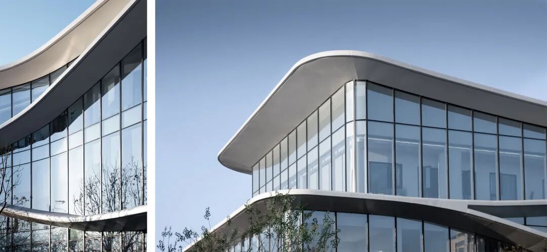 建筑立面表皮由银灰色铝板和low-e 玻璃幕墙窗系统构成,不同光泽度的细腻对比使建筑变得轻盈并富韵律感;随着一天中时间的变化,整座建筑群在阳光与水波的映照下也呈现出变幻的光彩。
