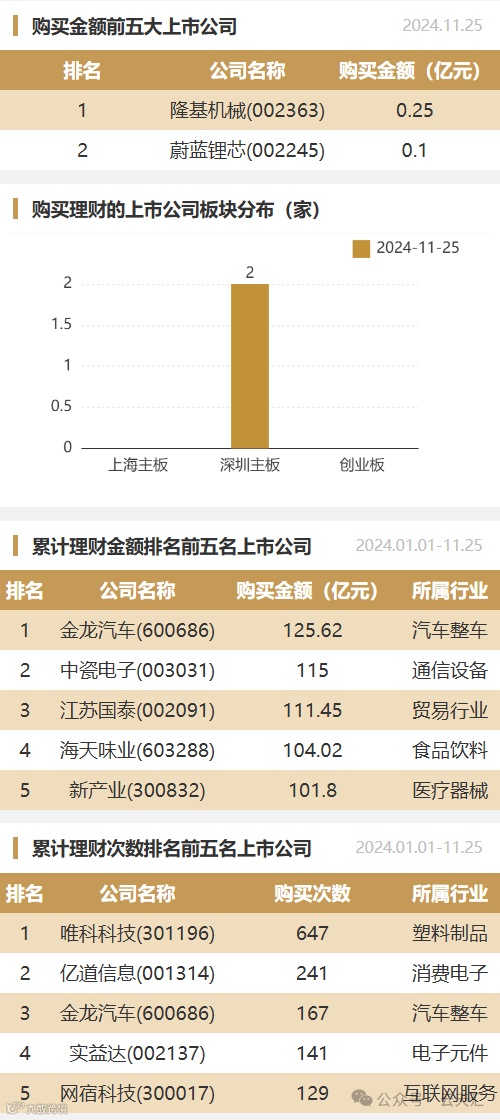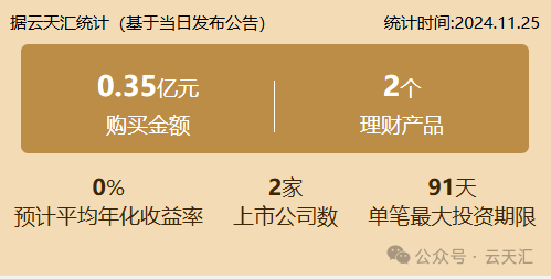 2024年11月25日,上市公司购买理财金额0.35亿元,共2家上市公司,理财产品2个。