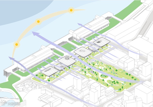 地铁及公交人流通过景观商业进入场地,增强舒适、可游性