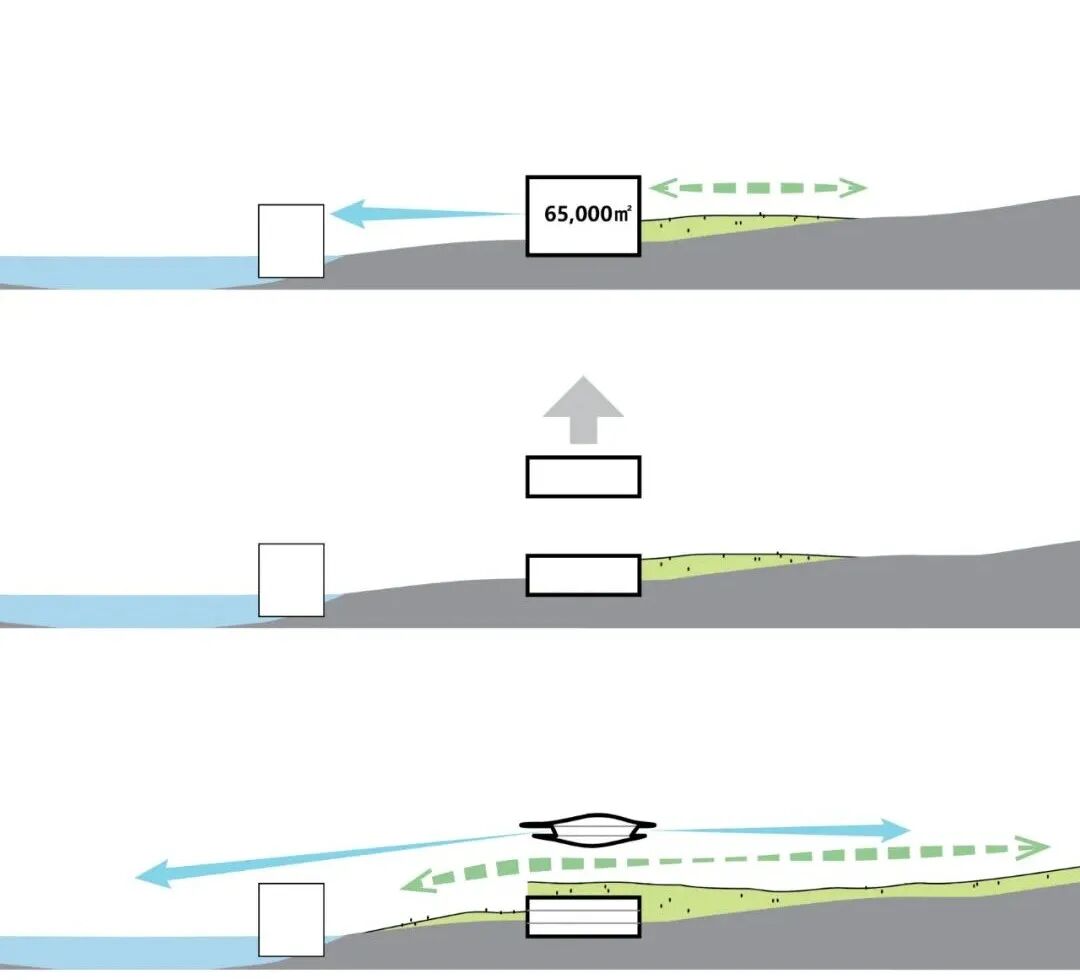 建筑巧妙地被抬升高于地面,让建筑内人们的观江视线变得开阔,不被码头提升装置所阻挡。