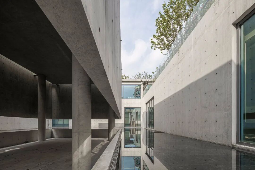酒店的禅修中心,或者说水院禅堂,更像一种“空”,它没有具体的功能定义,更像是一种精神性空间。禅堂作为一个悬浮的混凝土体块镶嵌在地面之中,被水面所包围。