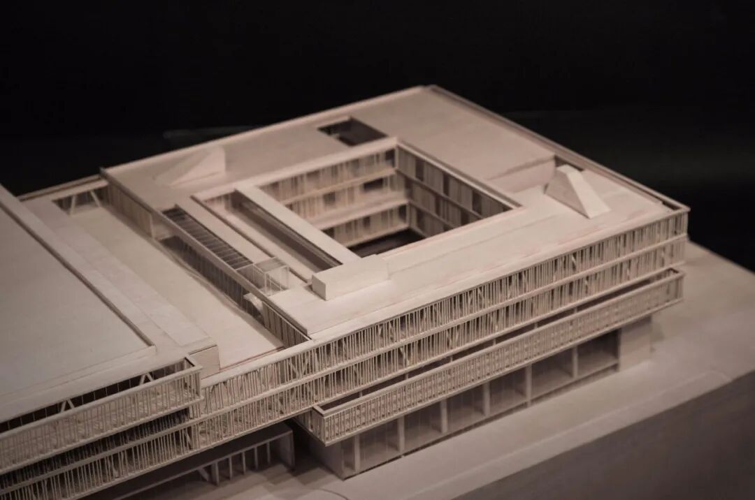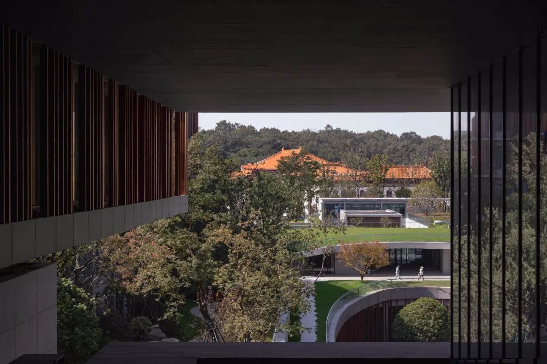 环绕的覆土屋面之下,设计引入了类似传统园林的回廊、曲廊等多种行进空间形式,以此包裹和划分庭院空间,并实现步移景异的观感。同时,结合包括格栅在内的“半透明”表皮,使景观经由建筑的檐下空间,渗透到建筑的室内中,提供了一种人与景观之间观看和对话的机会。