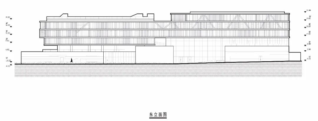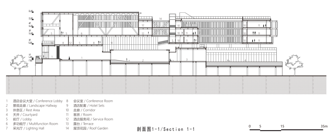 东楼主要由三部分功能空间构成:接待空间、宴会空间和客房空间。除接待空间外,方案将诸如商务、宴会和客房等效率化导向的主要功能空间架空在上层体量中。