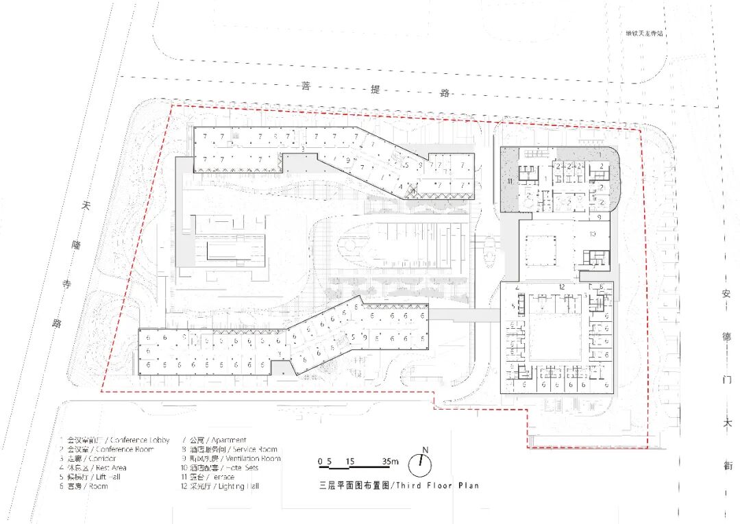 基于对“东城西林”的基地周边环境的响应,方案整体设置为“东动西静”、且自东向西打开的半围合布局。位于城市主干道西侧的主楼具有接待、商务、餐饮和客房等功能,同时也是面向城市的形象界面;南北两栋楼为客房楼, 拥有良好的景观与采光条件;被建筑环抱在中间则是以禅堂为代表的酒店公共功能空间和多重标高的景观庭院。