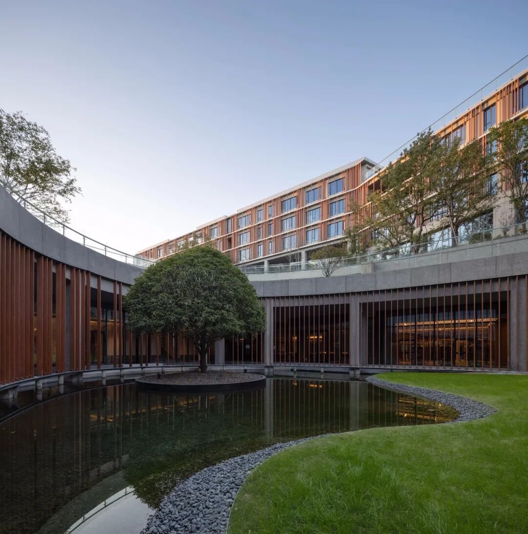 而与此同时,南京的酒店业态趋于饱和,却相对缺少具有高品质和体验感的酒店。南京丰盛五季凯悦臻选作为南京第一家凯悦系列酒店,提倡“以人为本、沉于山水、归于内心的体验方式”,正好填补了这类特色酒店的空白。因此,如何在部分建成的现有建筑基础之上,融合场地周边历史人文景观、绿色生态环境与高品质体验空间等要素,成为这个项目改造设计工作重要目标。