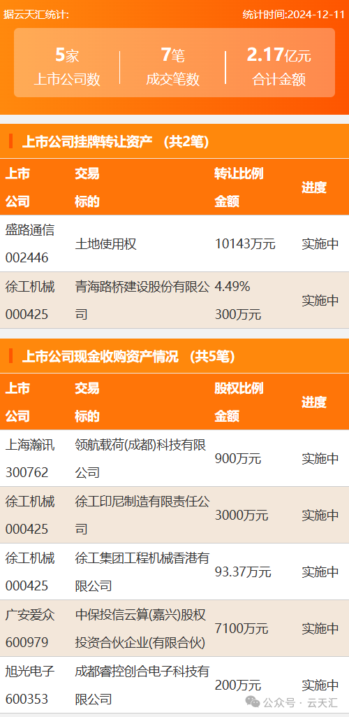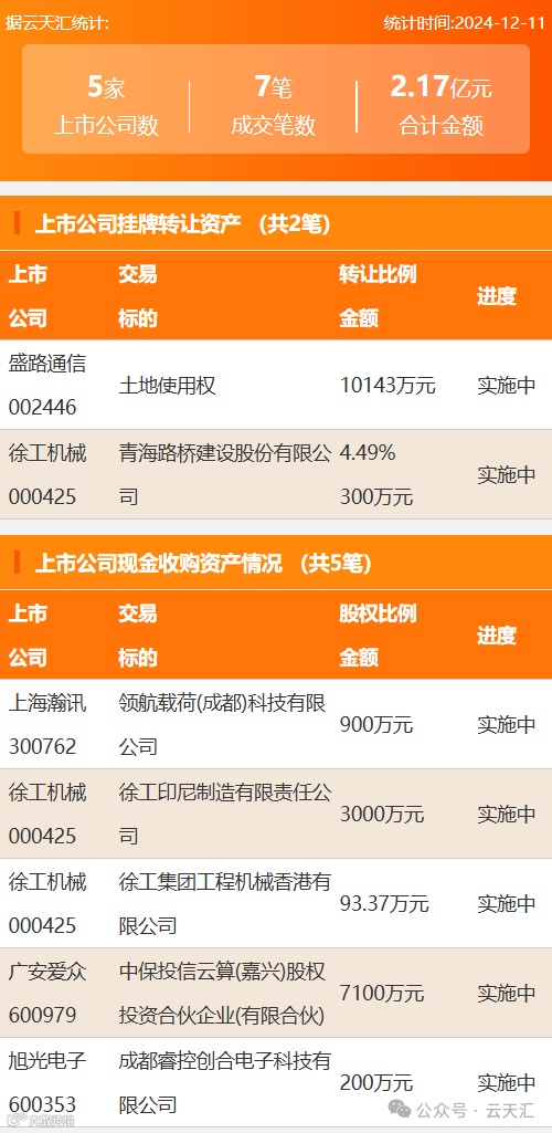 2024年12月11日,资产交易成交金额2.17亿元,上市公司5家,成交7笔,上市公司挂牌转让资产2笔,现金收购资产5笔。