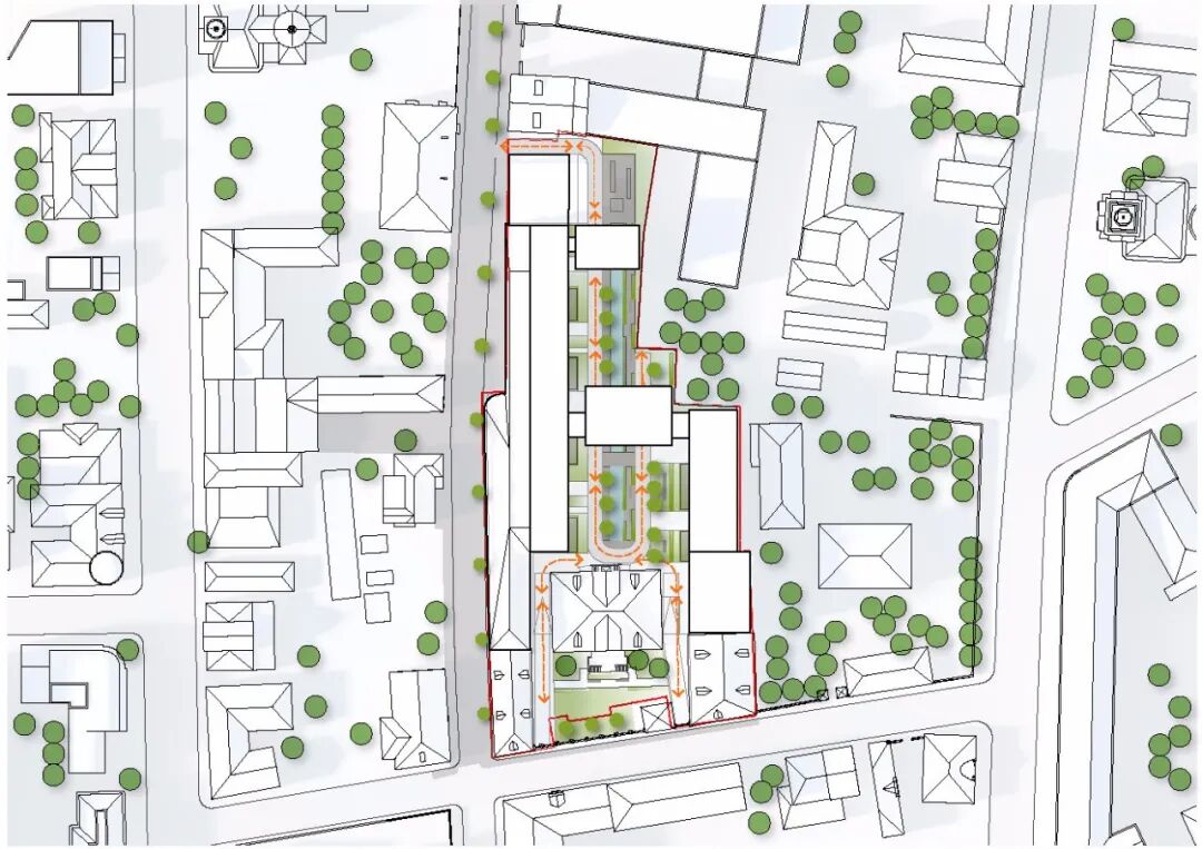 为了将庭院改造成一个绿色、宁静的空间,其中两座建筑物使用高跷进行了架高。通过用水、桦树和苹果树、谷物和艺术品进行景观美化,营造出宁静而现代的绿洲。公寓的所有入口都面向庭院的焦点——经过修复的历史豪宅的后立面,为居民创造了一种地方感和社区感。