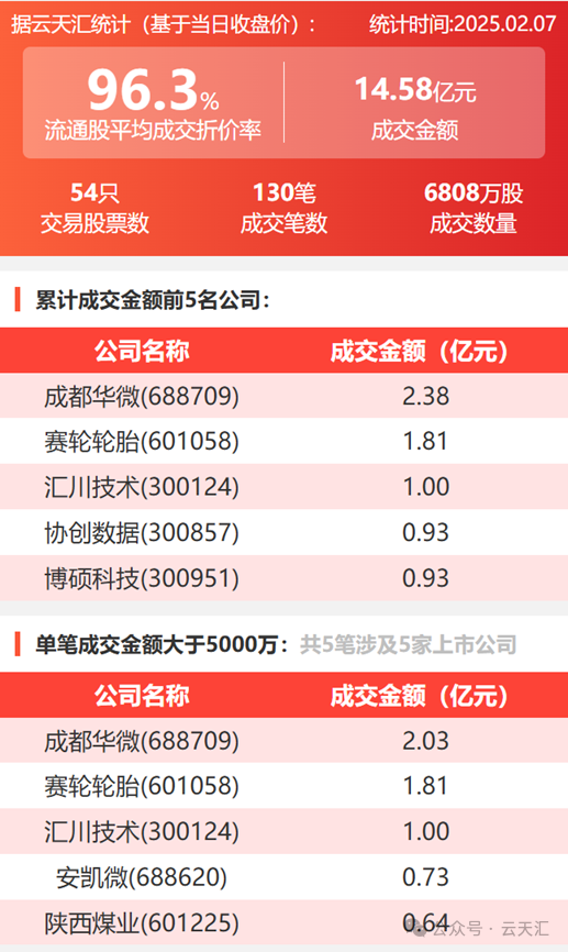 2025年2月7日,大宗交易成交金额14.58亿元,交易股票数54只,成交笔数130笔,流通股平均成交折价率96.3%,成交数量0.68亿股。
