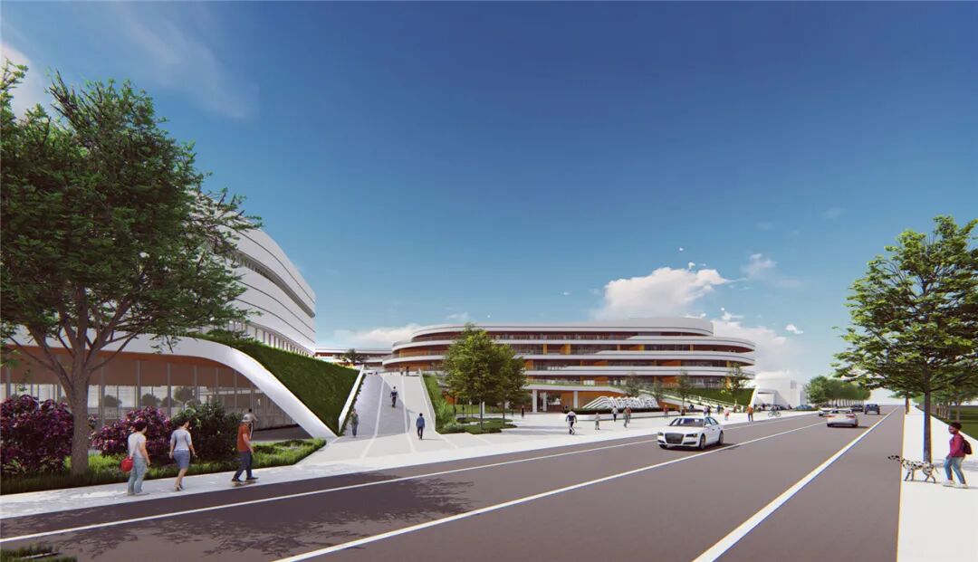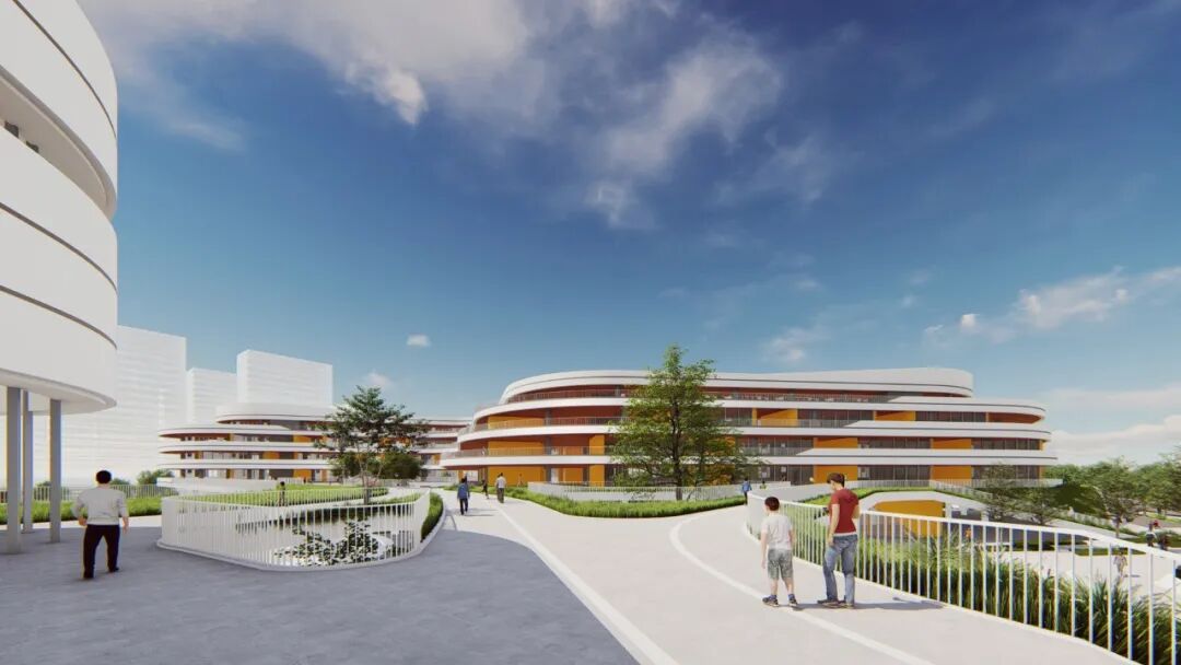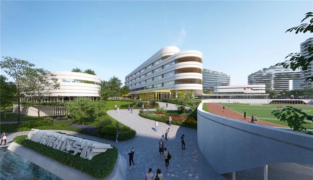本案作为未来社区的“智慧核”,具有将教育和生活的强关联的功能需求。设计利用最新的网络技术,打造社区青少年线上线下联动的学习交流平台,搭建“人人为师”共享学习平台,倡导终身学习新风尚。学校的立面与未来社区建筑的风格统一,以白色作为主色调,通过曲和直的线条搭配,柔化校园形象。