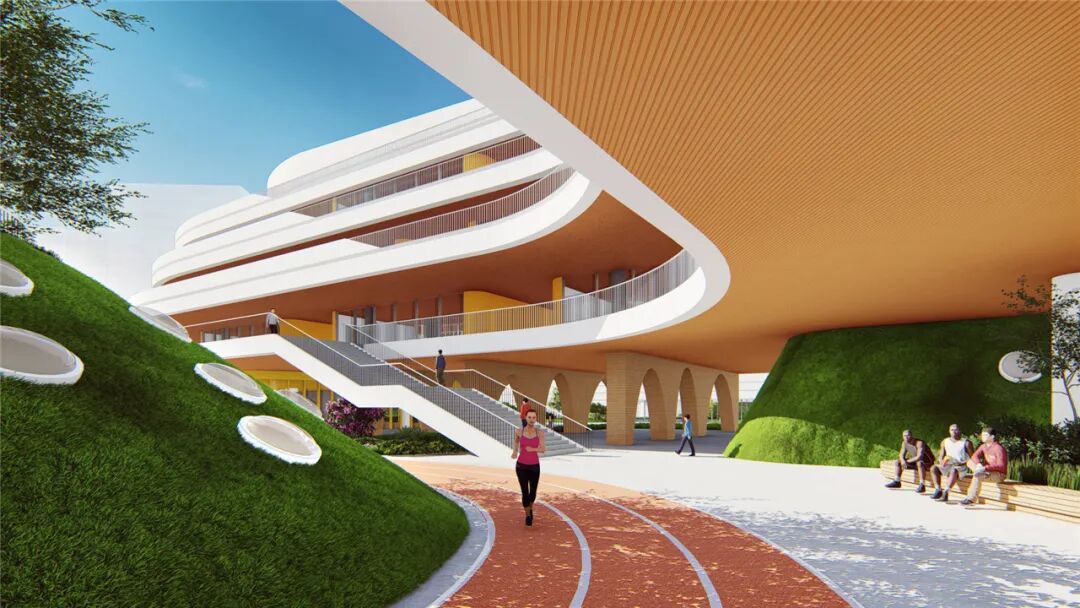 校园底层的连续架空构建随处交流、随处学习的新式教学空间模式;大面积的草地、绿坡、庭院创造多维度的立体空间。组团庭院用木、石等自然元素,为精心排布的空间赋予生机与活力。绿色生态的校园环境、层次丰富的交流平台,为老师和学生们营造出色彩缤纷的学习和生活空间。