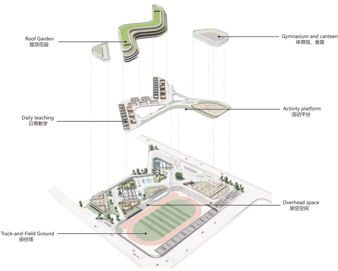 校园的建筑顺应地形,整体抬升,功能上下分置。底层架空隆起成不同形态的“山丘”,其间置入共享空间;在上部布局校园主要教学用房,继而柔化建筑外部,形成一朵朵漂浮的“云”的意向形态;最后通过连续通达的平台将所有的建筑体量以及上下层空间组织在一起,形成便捷的交通网络。功能的上下叠置自然的产生许多有趣且丰富的灰空间,可成为日常教学、社区共享、休息活动和生态体验的优良载体。