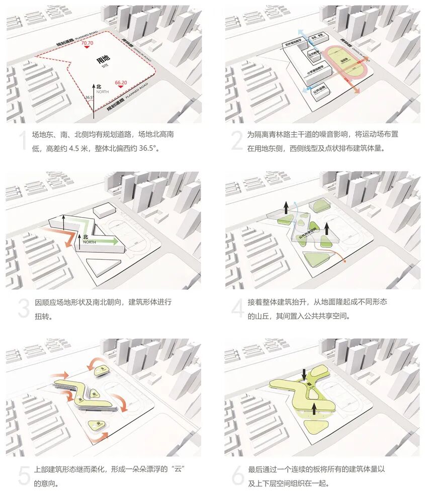 本案从自然风貌之“云”与未来社区之“云”汲取灵感,以“云”为设计理念,用云的层叠柔软赋予校园温柔包容的外形,借云的连结共享赋予校园作为整个社区智慧核心连结社区和知识的平台。