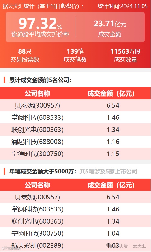 2024年11月5日,大宗交易成交金额23.71亿元,交易股票数88只,成交笔数139笔,流通股平均成交折价率97.32%,成交数量1.16亿股。
