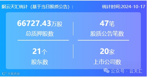 2024年10月17日,股票质押总质押股数6.67亿股,上市公司数20家,股质公告笔数47笔,股东数21个。