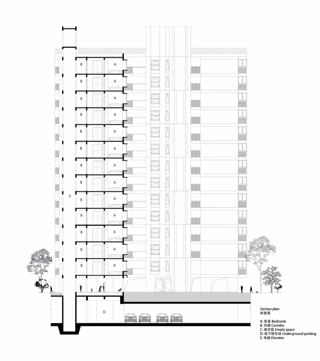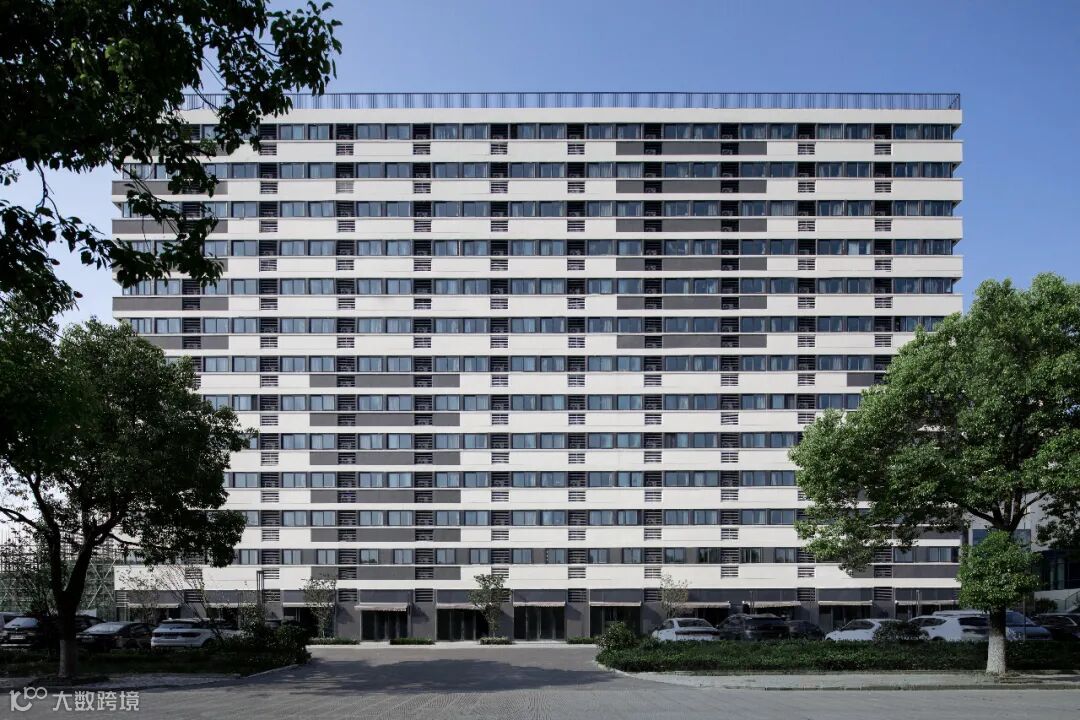 设计大胆地使用深灰和白两种对比强烈的颜色,在不同的层间和开间中寻找比例关系,运用色彩构成的逻辑形成现代感十足的立面效果。