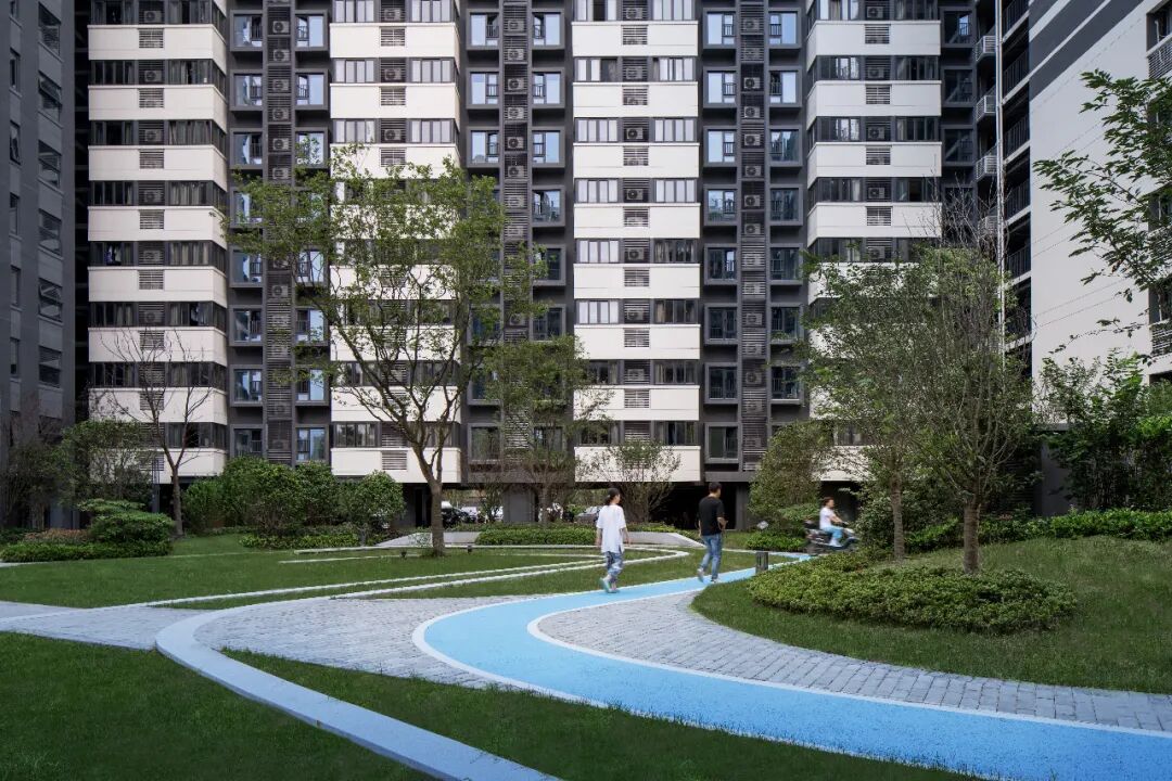 社区内部底层全架空,在设计上呈现出开放性,与社区景观、休闲健身等场所相融合,形成1+1>2的集合优势。后疫情时代,愈加注重全区的健康生活习惯,贯穿全区的1km漫步道与集中绿地融为一体,途经各活力中心;一面享受置身公园般的愉悦环境,一面不错过正在发生的各种社区活动。