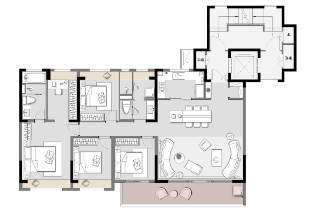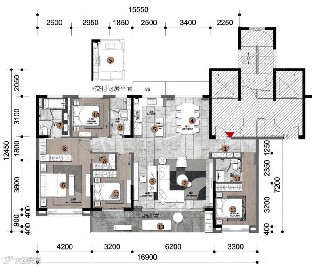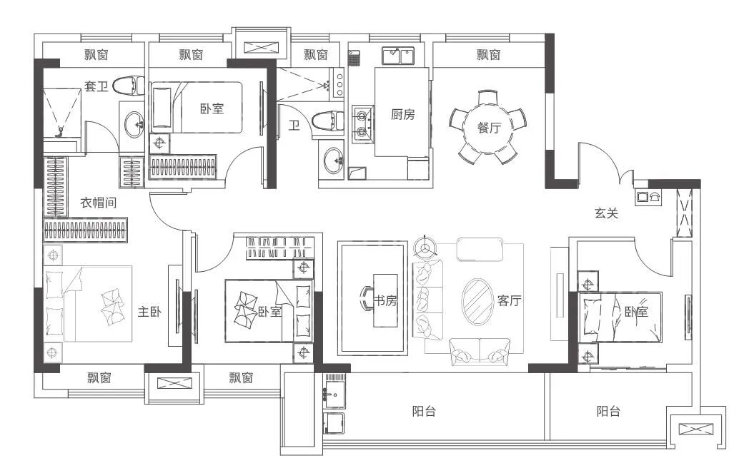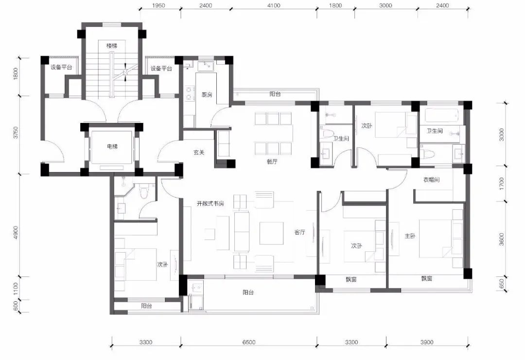 同样杭州棠玥湾洋房神164㎡户型。所有卧室开间都很舒适,主卧套开间达3.9米,次卧套3.3米。南向总面宽达15.9米,阳台足足有8.7米长。