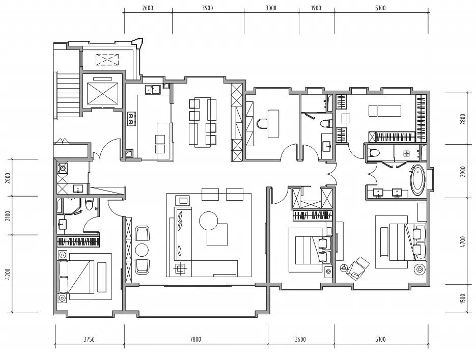 245平的“4+1”户型,整体开间超过了20米,进深11.3米。横厅开间达到8.1米,双套房设计。