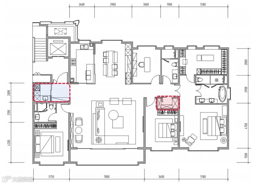 重庆·融创壹号院推出了约139㎡的户型,套内能达到约117㎡,北侧观景阳台作为独立家政间,次卫做到了干湿分离。