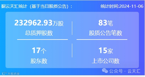 2024年11月6日,股票质押总质押股数23.29亿股,上市公司数15家,股质公告笔数83笔,股东数17个。