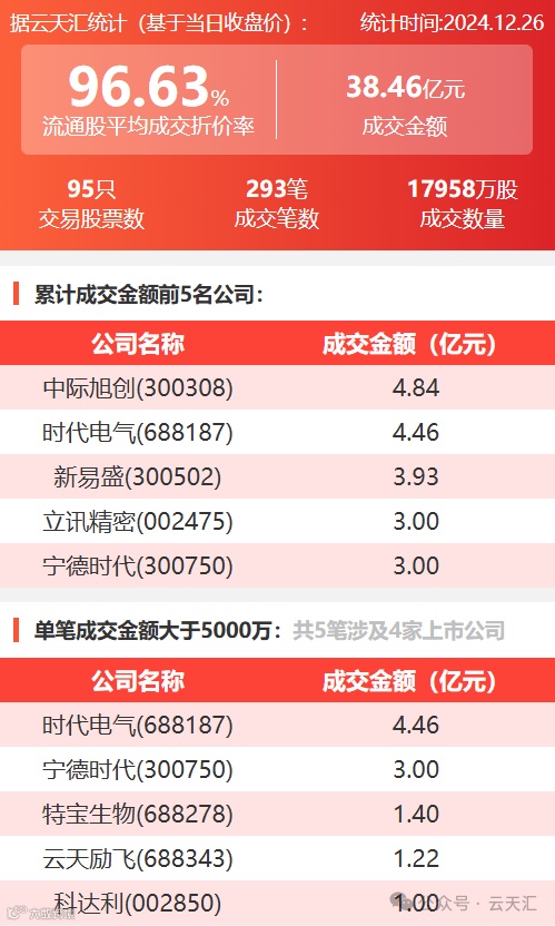 2024年12月26日,大宗交易成交金额38.46亿元,交易股票数95只,成交笔数293笔,流通股平均成交折价率96.63%,成交数量1.79亿股。
