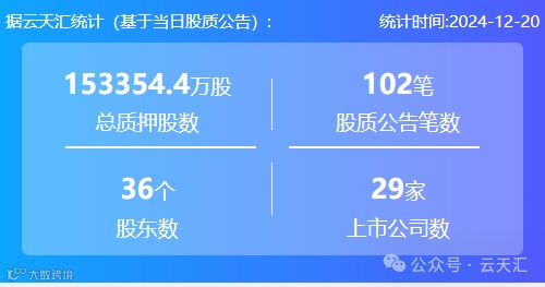 2024年12月20日,股票质押总质押股数15.33亿股,上市公司数29家,股质公告笔数102笔,股东数36个。