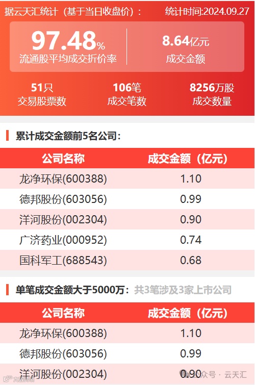 2024年9月27日,大宗交易成交金额8.64亿元,交易股票数51只,成交笔数106笔,流通股平均成交折价率97.48%,成交数量0.83亿股。