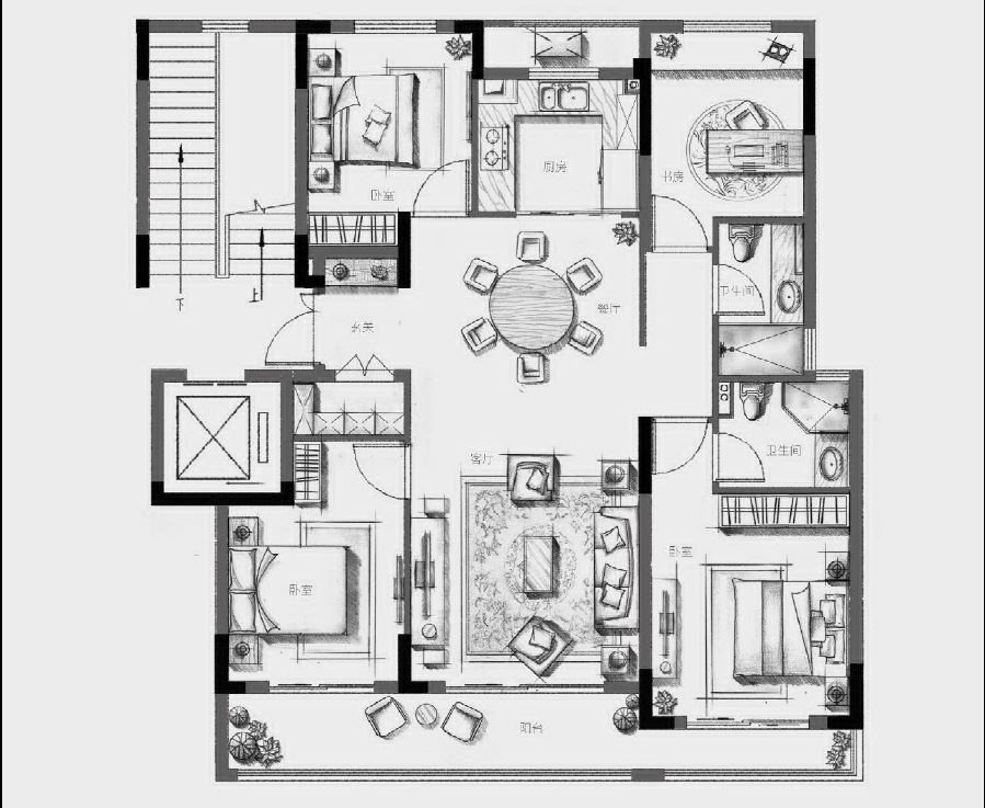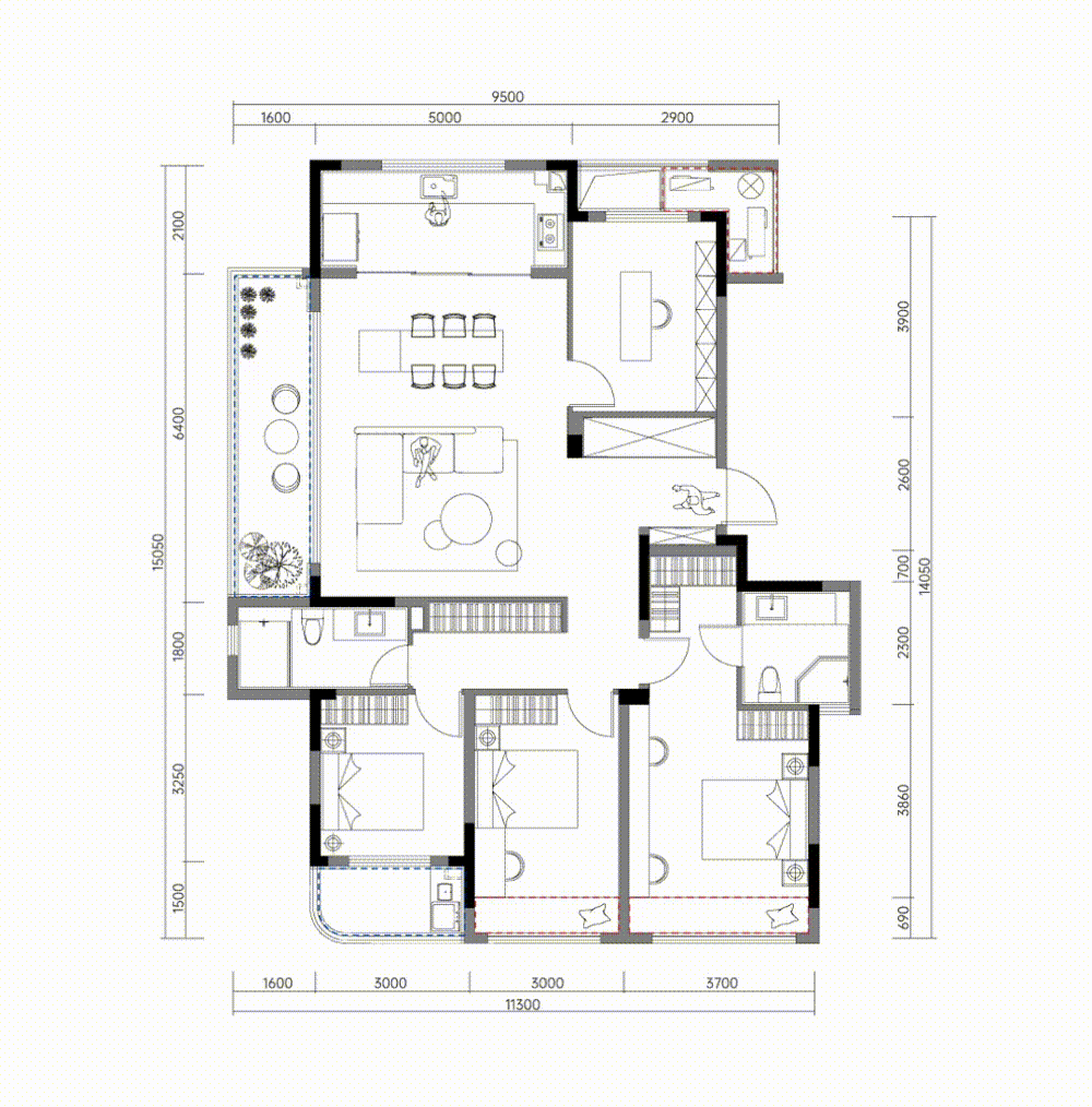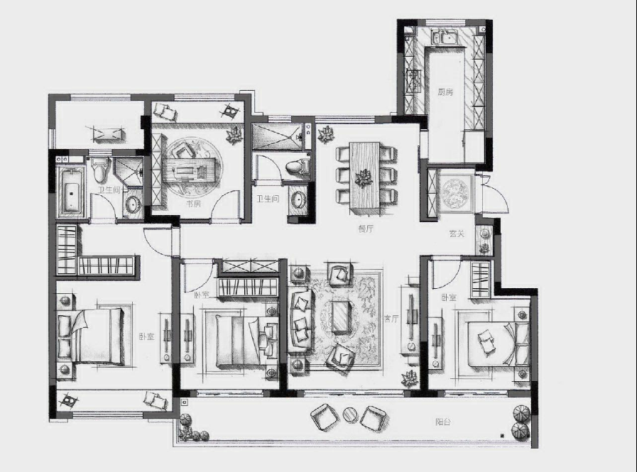 建筑面积约125㎡是一个经典的四叶草户型,四个房间分布在四个角上,更大限度地减少了面积的浪费,将更多公共空间纳入到餐客厅之中,并保障各个休憩空间互不打扰。三开间朝南格局,加上一个南向双开间的大阳台,餐厅、客厅、阳台一字相连,给居家以阔绰感,容纳更多的生活趣味。