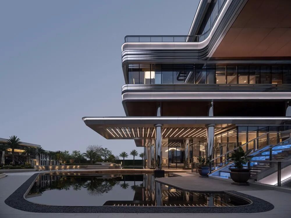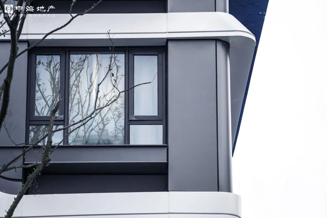 中海•铂隽建筑立面整体设计,承袭扎哈•哈迪德的流体美学,以奥体场馆为灵感,流畅弧面如曲水流动,曲线造型衍生变幻的光影空间。