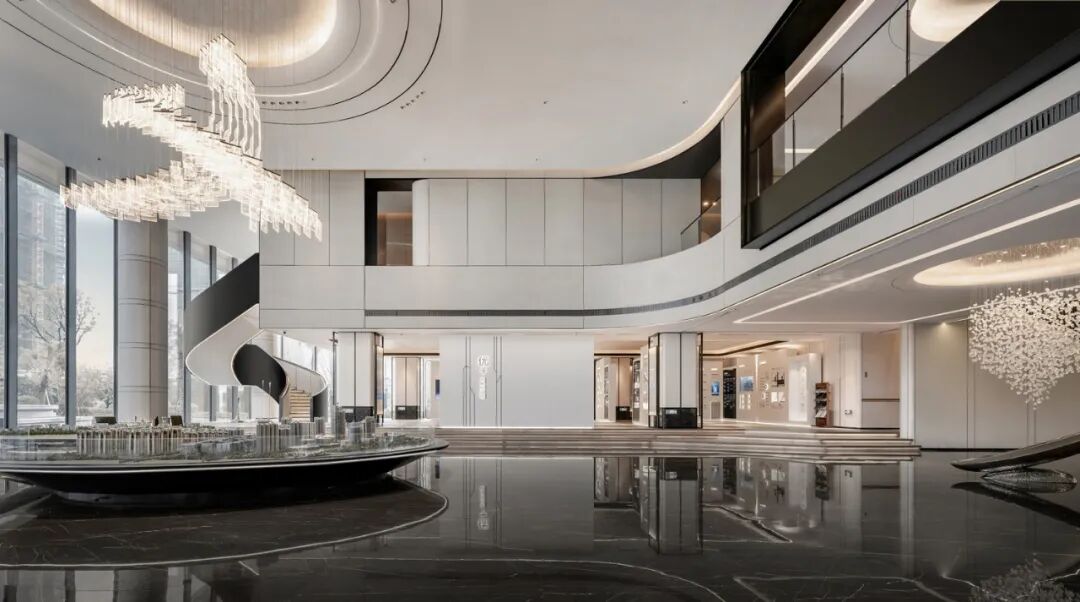 大堂内部多处采用新颖的曲面线条。优雅的弧度蜿蜒迭起,使得整个空间张弛有度、明朗清晰。时尚的设计质感点滴浸润,大气与奢雅在此交融相映,尽呈空间的艺术审美。