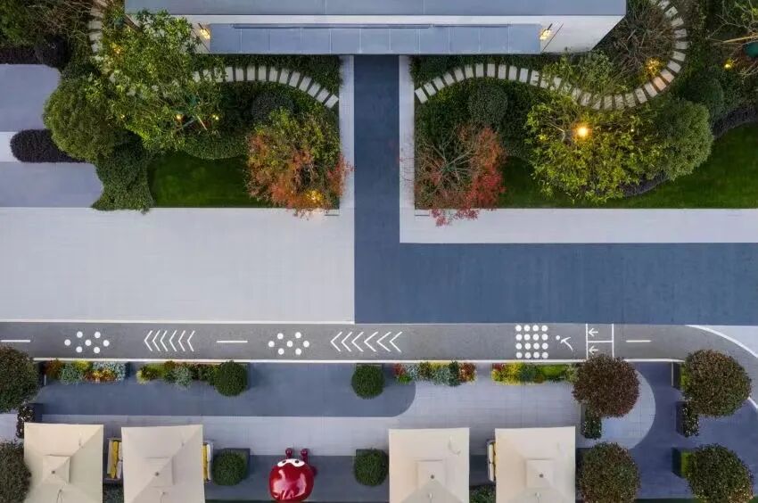 地库通道两侧以瓷砖、金属材质铺面,让整个入口显得颇有质感。瓷砖上以LED灯用以导视,醒目清晰,为行车带来便捷。下坡道错落石块铺面,不仅实现了减速的功能,同时也为行车带来更为安全、舒适的体验。