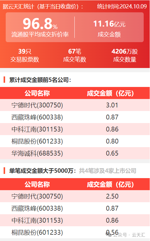 2024年10月9日,大宗交易成交金额11.16亿元,交易股票数39只,成交笔数67笔,流通股平均成交折价率96.8%,成交数量0.42亿股。