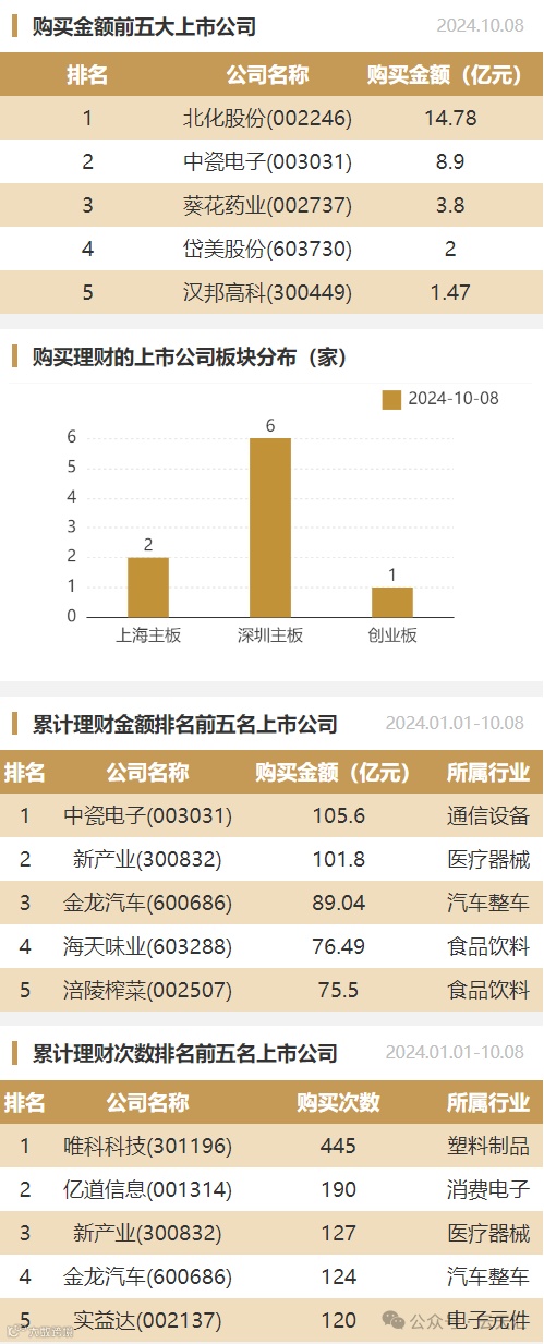 2024年10月8日,上市公司购买理财金额32.55亿元,共9家上市公司,理财产品22个。