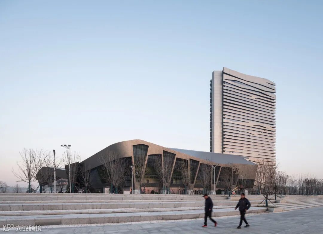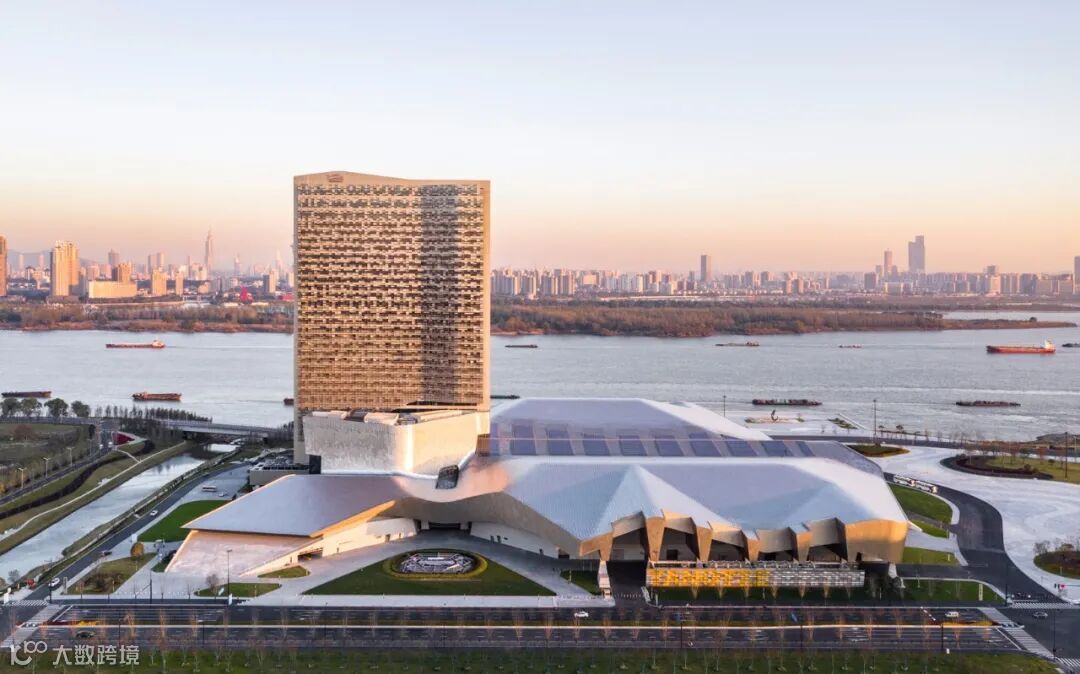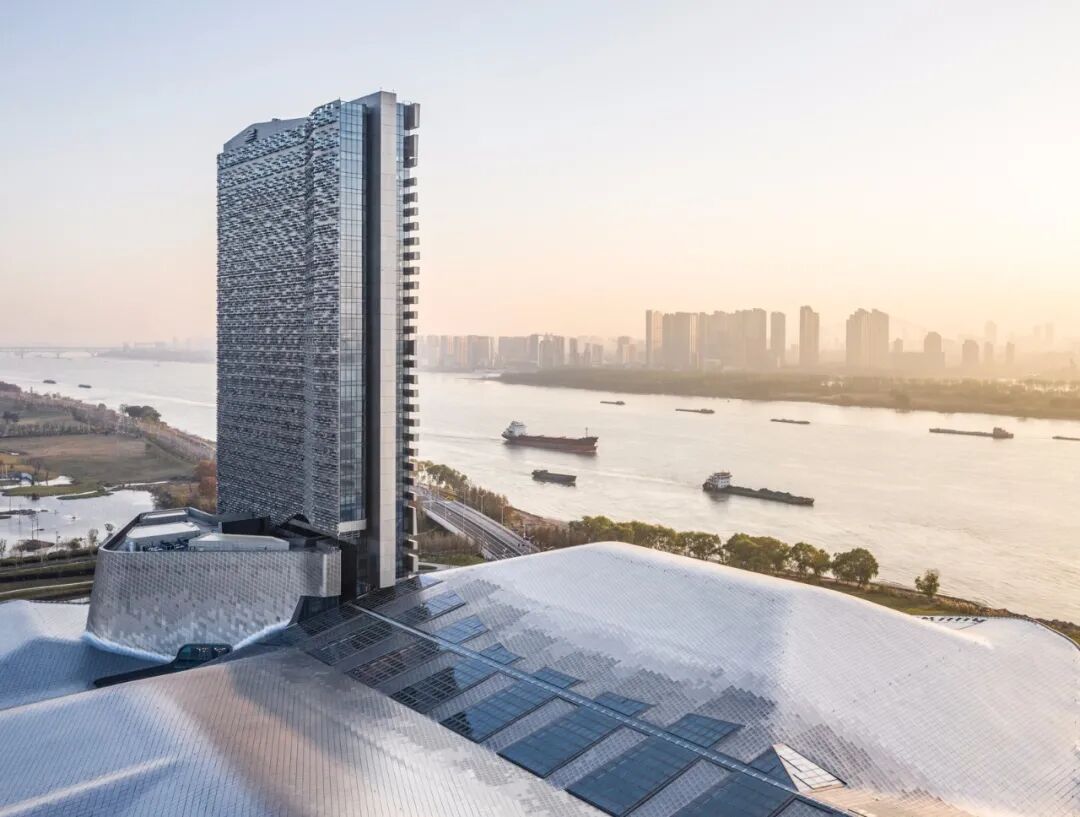 在建筑形式上,起伏的裙楼呼应了长江上的层波叠浪,泛光的钛板屋顶反射着江面粼粼波光。高耸、开阔的塔楼仿佛江上穿梭的中式帆船,扬帆弄影、乘风破浪。