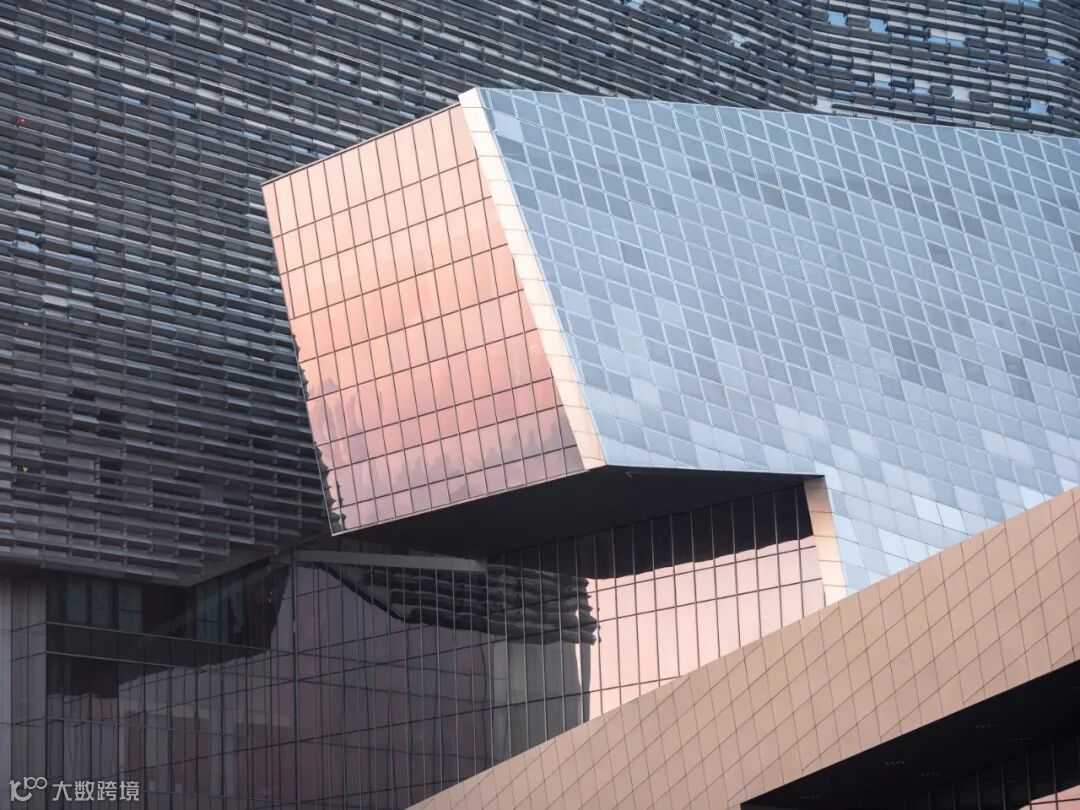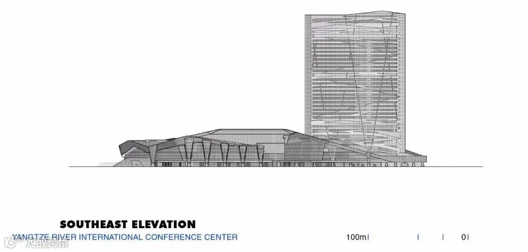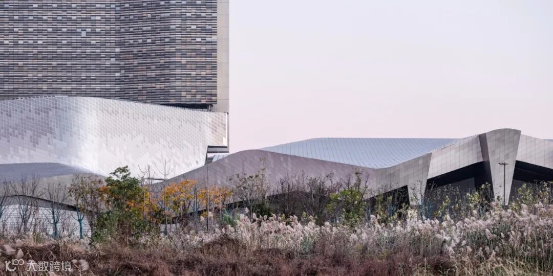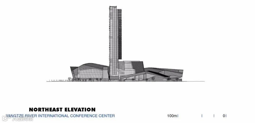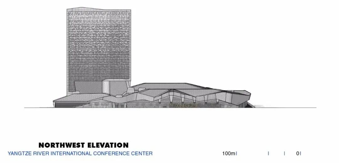 为更好地融入江北都市区及扬子江畔的双重肌理,扬子江国际会议中心外观兼具都市建筑特征与波浪型曲线。塔楼北面朝向城市,立面采用金属遮阳系统,使用了阳极氧化铝板材料,能够实现复合效应:白天,金属幕墙用于遮阳、提高能效;夜晚,集成在幕墙上的照明系统则赋予大楼独特的外观。塔楼南面朝向扬子江,蜿蜒起伏的立面与江滨自然风光相呼应。其幕墙由90,000余块特制的阳极氧化铝板及玻璃构成。