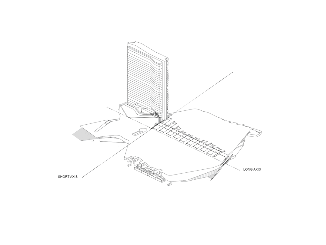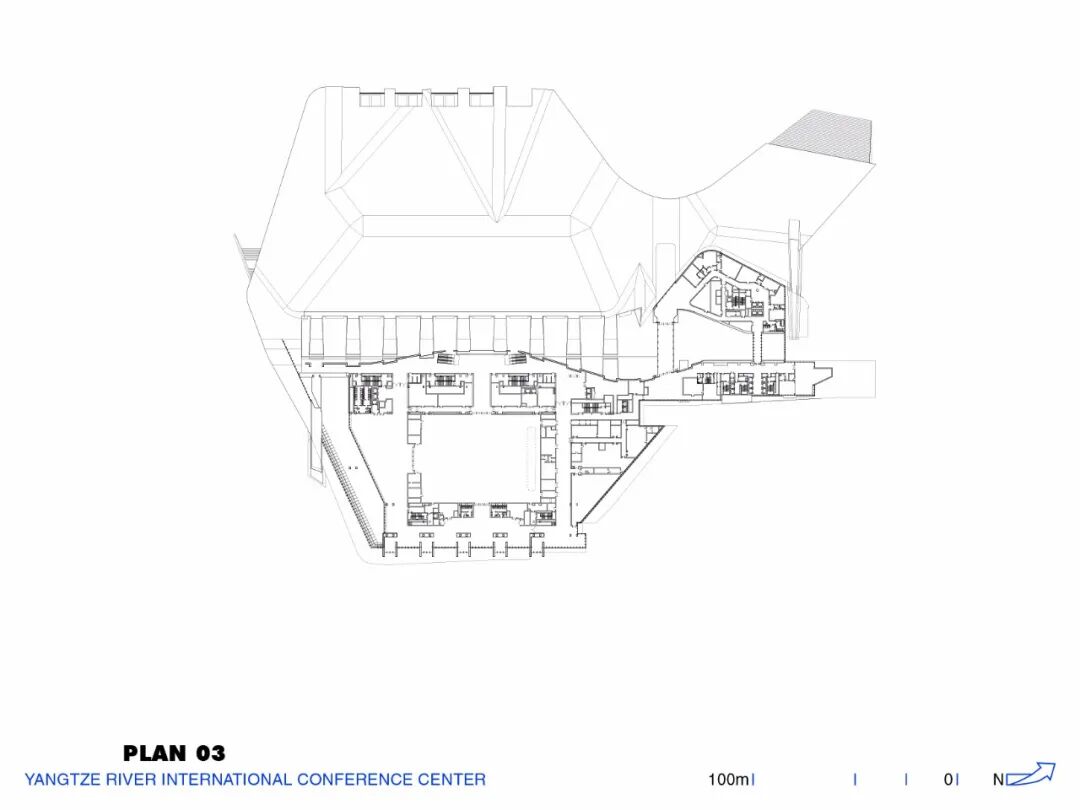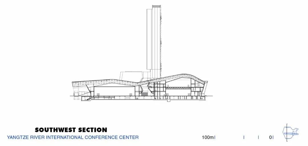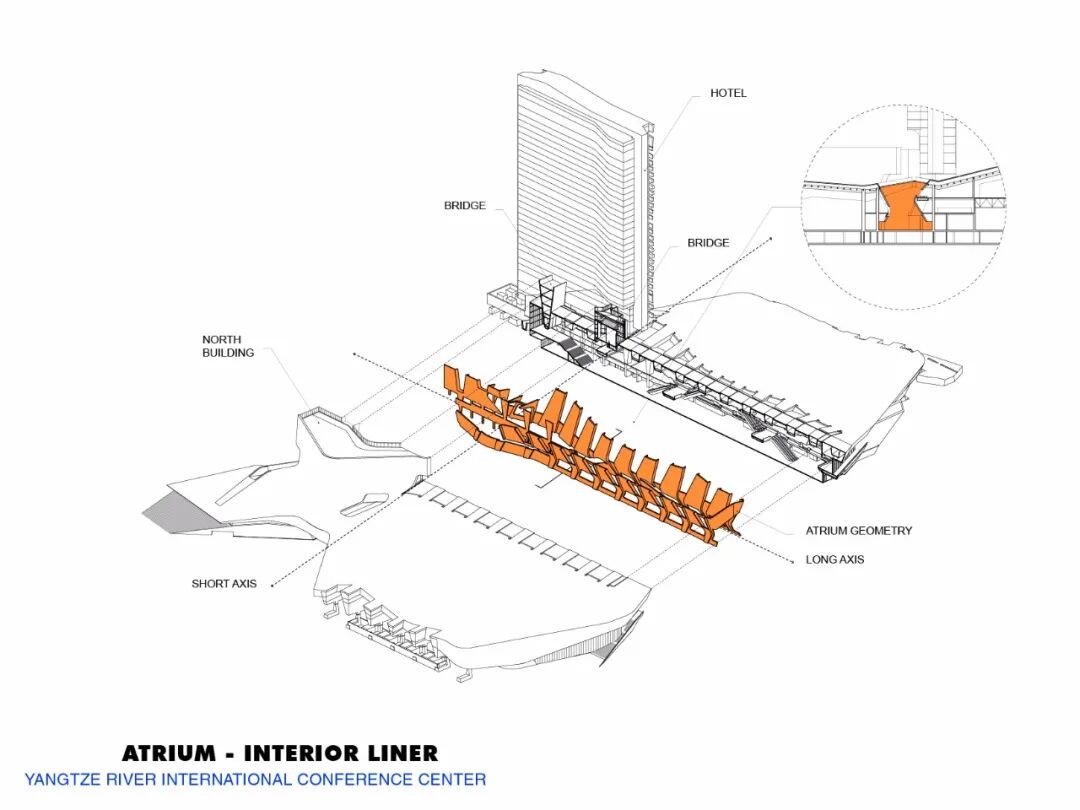 会议中心的裙楼中,会议中心面积超过36,000㎡,而不同的功能需求决定了建筑的分区设计。单体塔楼是一座拥有340间江景客房的酒店。裙楼巨大的会议区由钢框架和空间矩形桁架构筑,形成一系列围绕中央拱廊布局且尺度各异的会议与展示空间。200米的东西向中央通廊将裙楼分为南北两翼。