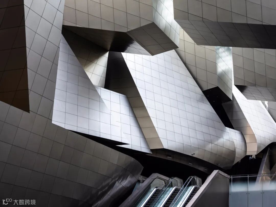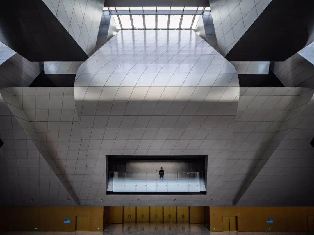 廊内天桥纵横交错,构成裙楼的交通枢纽,同时连通VIP入口及酒店塔楼。巨大的天窗为裙楼主入口及中庭提供自然光,也方便访客仰视塔楼。建筑内外使用相同的金属表皮,在模糊室内外空间的同时,塑造出别具匠心的流畅空间曲线。