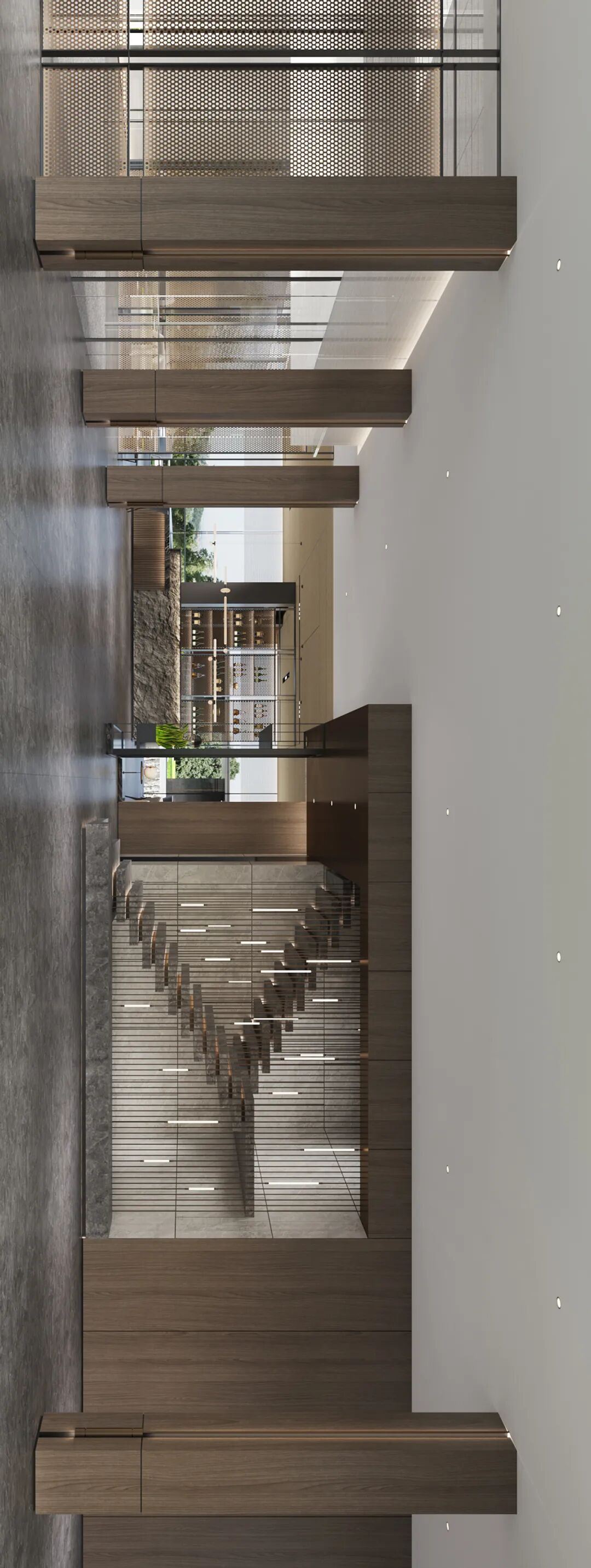 作为垂直枢纽,楼梯间纵列以金属条贯穿串联,通过叠级、体量、虚实、光线和触感之间的不断交融,凸显雕塑般的廓形与轻盈的悬浮感,也释放出精简纯粹的张力。