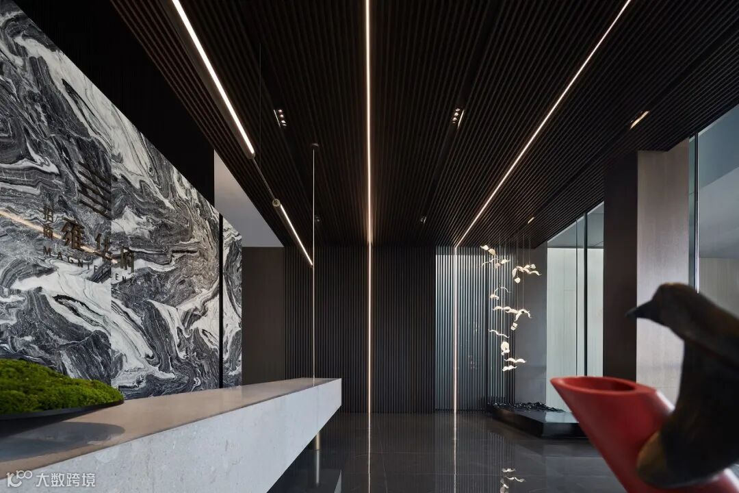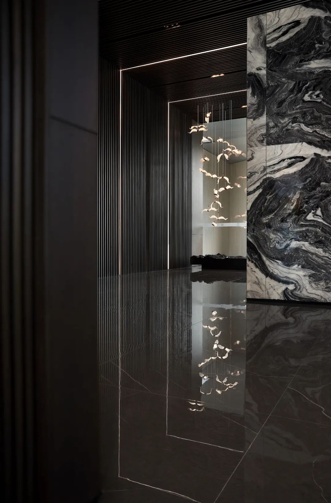接待前厅个性纹理的石材引人注目,灯带点缀于格栅之中,并从墙面一折而上延伸至顶面,此外体块穿插、构成关系于此自由表达,多种材质、肌理的碰撞配比,让层次更加鲜明。既打破了沉闷、单调,又在一开场便勾勒出大气的东方韵味。