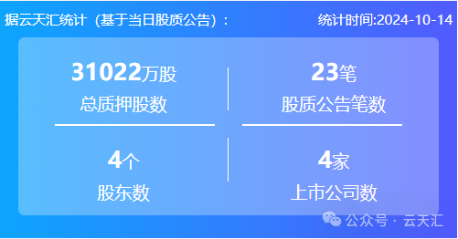 2024年10月14日,股票质押总质押股数3.1亿股,上市公司数4家,股质公告笔数23笔,股东数4个。