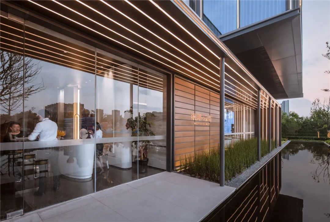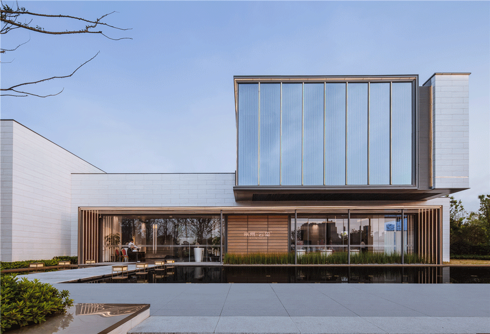 内院建筑呈围合之势与一方池水共同营造私密宁静的归属空间。一层大面超白玻璃模糊了室内与室外的边界,空间界面的隐退,建筑与自然相互渗透,强化了人与自然的互动体验。
