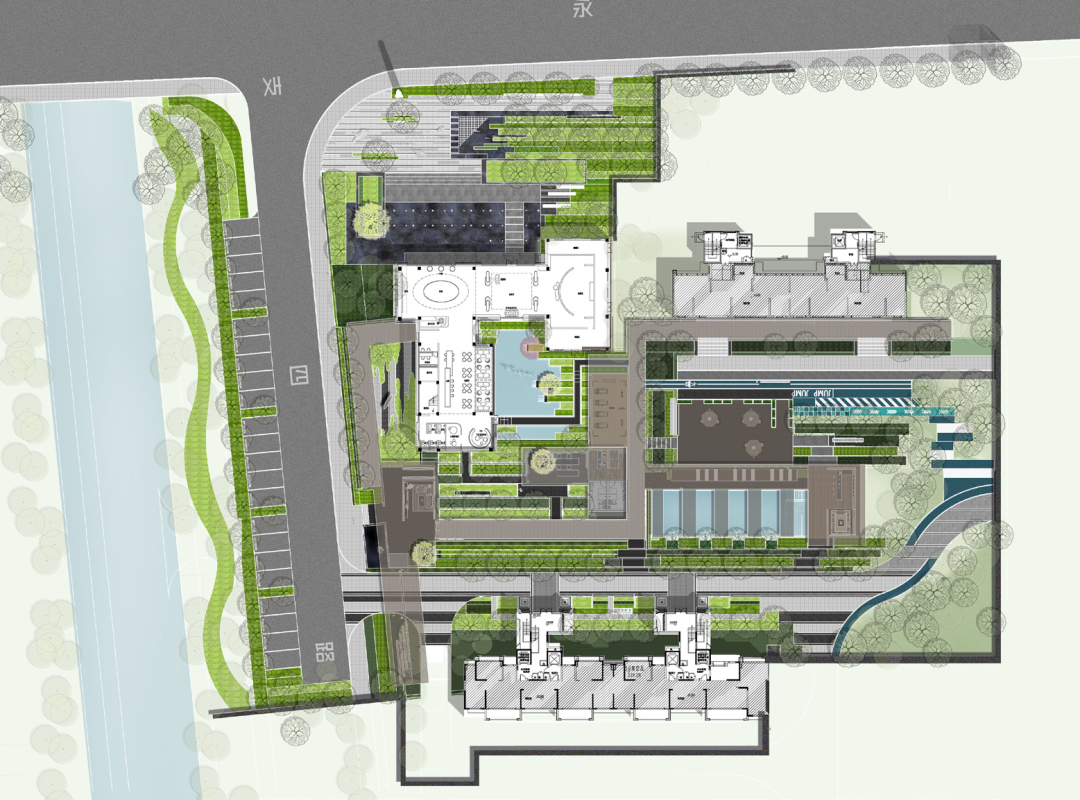边界不是分割,而是共享的,利用城市绿地及红线退让形成的退让广场与城市共享,公共资源最大化,缝合城市、广场、社区,营造出一个让人们可以停留的场景,就像一座城市的驿站,一个街角的客厅,人们在此可以暂时忘却城市的纷乱与喧嚣。